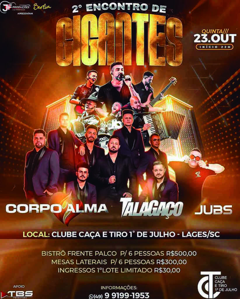 Lages vai tremer no ritmo da boa música! Vem aí o 2º Encontro de Gigantes, um evento que promete marcar a história da região serrana. Três grandes nomes do entretenimento sobem ao mesmo palco para uma noite de pura energia e diversão: Corpo & Alma, Talagaço e DJ Jubs.