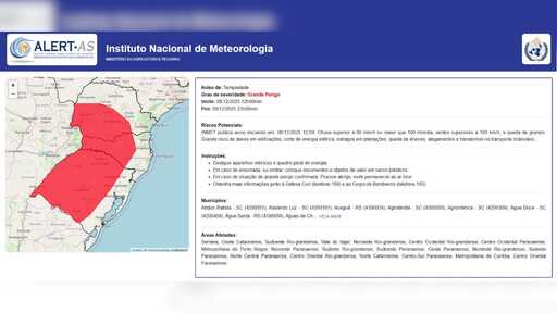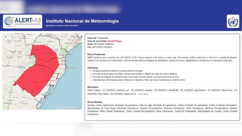 O Instituto Nacional de Meteorologia (Inmet) emitiu um alerta vermelho entre o meio-dia desta segunda-feira (8) e 23h59min de terça-feira (9) para Santa Catarina, Rio Grande do Sul e Paraná. O aviso prevê chuva acima de 60 mm por hora ou mais de 100 mm por dia, ventos superiores a 100 km/h e queda de granizo.