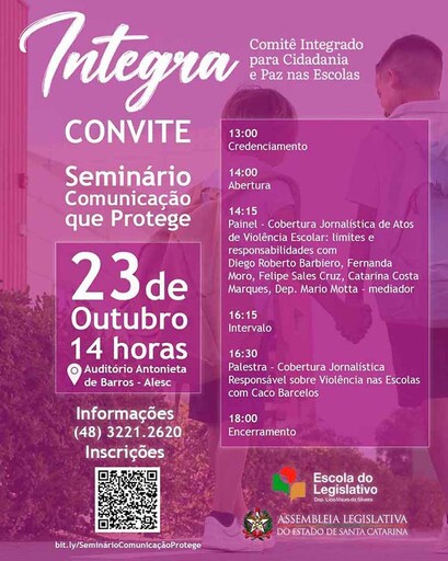 O Comitê Integrado para Cidadania e Paz nas Escolas, por meio da Assembleia Legislativa de Santa Catarina (Alesc), realiza no dia 23 de outubro, às 14h, o seminário “Comunicação que Protege”.