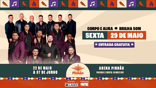 A Arena Pinhão abre oficialmente sua programação no dia 29 de maio, no Parque de Exposições Conta Dinheiro, com uma noite de shows que marcam o início das apresentações na arena de shows da 36ª Festa Nacional do Pinhão. Sobem ao palco Corpo e Alma e Brilha Som, com entrada gratuita.