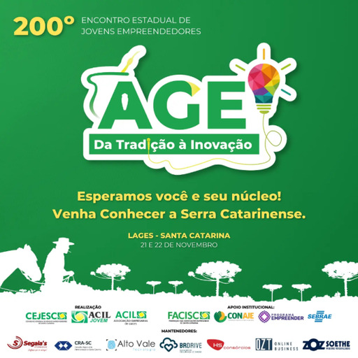 O Núcleo de Jovens Empreendedores da Associação Empresarial de Lages – ACIL Jovem está na reta final dos preparativos para sediar a 200ª Assembleia Geral Extraordinária - AGE do Conselho de Jovens Empreendedores de Santa Catarina – CEJESC, que encerra o calendário anual do conselho. Com o tema “Da Tradição à Inovação”, este é o último grande evento do calendário anual do conselho e será realizado nos dias 21 e 22 de novembro, no Serrano Tênis Clube, em Lages.