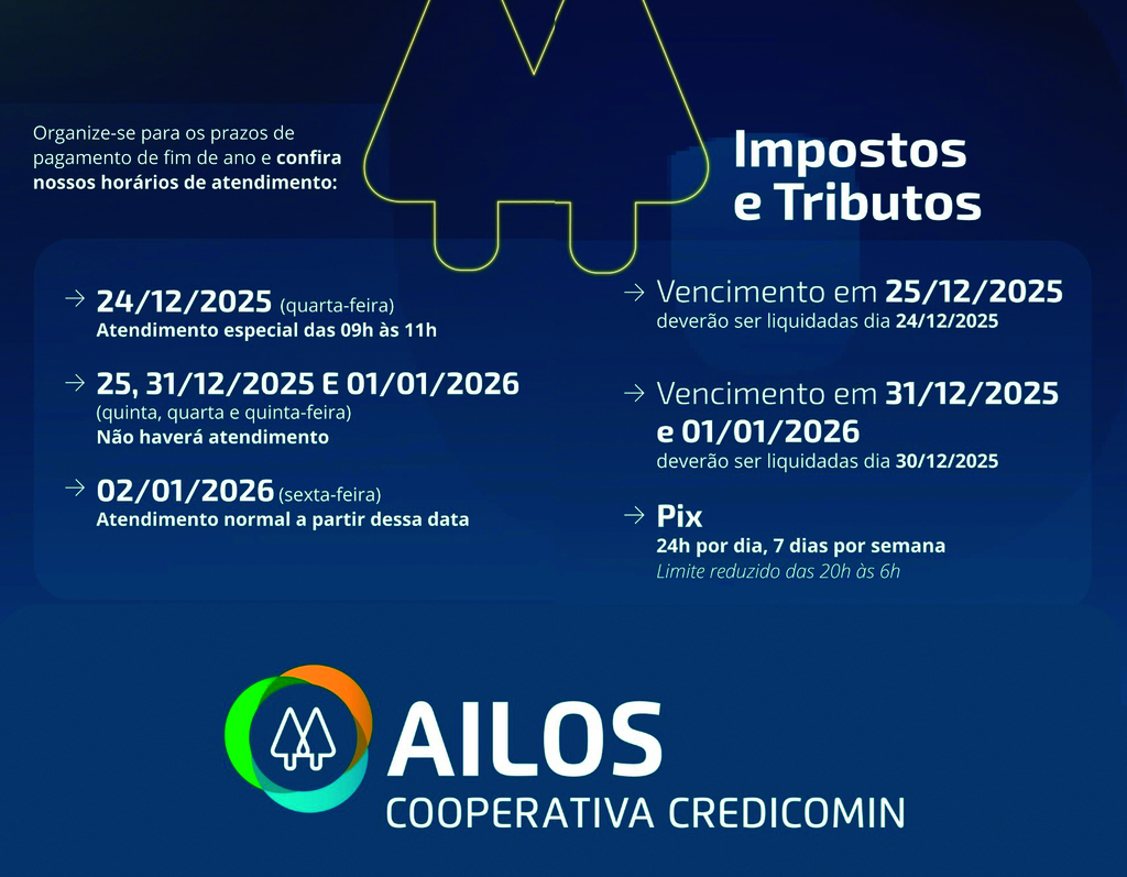 A Ailos Cooperativa Credicomin, informa seus cooperados os horários de atendimento para o período de festas, além de orientações sobre prazos para pagamento de contas e funcionamento dos canais digitais.