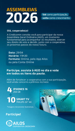 A Ailos Credicomin realizará no dia 29 de abril, às 19h30, sua Assembleia Geral Ordinária (AGO) 2026, no formato online, por meio do App Ailos e da Conta Online. O encontro é um momento fundamental para que os cooperados acompanhem os resultados de 2026 e os plano para o futuro da Cooperativa. Os cooperados que assistirem à AGO e votarem em todos os itens da pauta do dia concorrerão a 4 iPhones 16 (256 GB) e 10 Smart TVs Philips de 50 polegadas 4K. A participação fortalece a cooperativa e reforça o compromisso com a gestão democrática. Maiores informações em Credicomin.coop.br