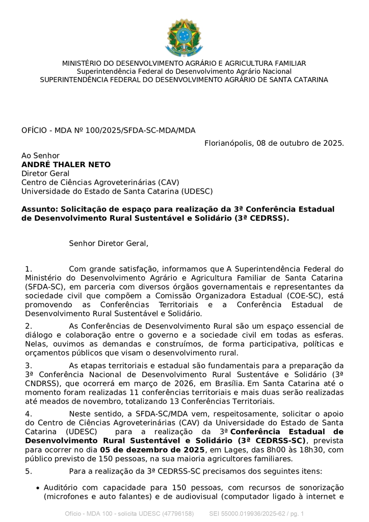 A respeito da 3ª Conferência Estadual de Desenvolvimento Rural Sustentável e Solidário, a Direção do Centro de Ciências Agroveterinárias (CAV) da Udesc Lages recebeu do Ministério do Desenvolvimento Agrário e Agricultura Familiar (MDA) uma solicitação de espaço para a realização do evento. O documento consta em anexo a este e-mail. Como instituição pública, a Udesc Lages segue resoluções de cedência de espaço para realização de eventos de outras instituições e órgãos públicos e, portanto, atendeu à solicitação. O auditório Prof. Flávio Krebs Ramos foi o espaço designado para tal, devido à disponibilidade no horário.