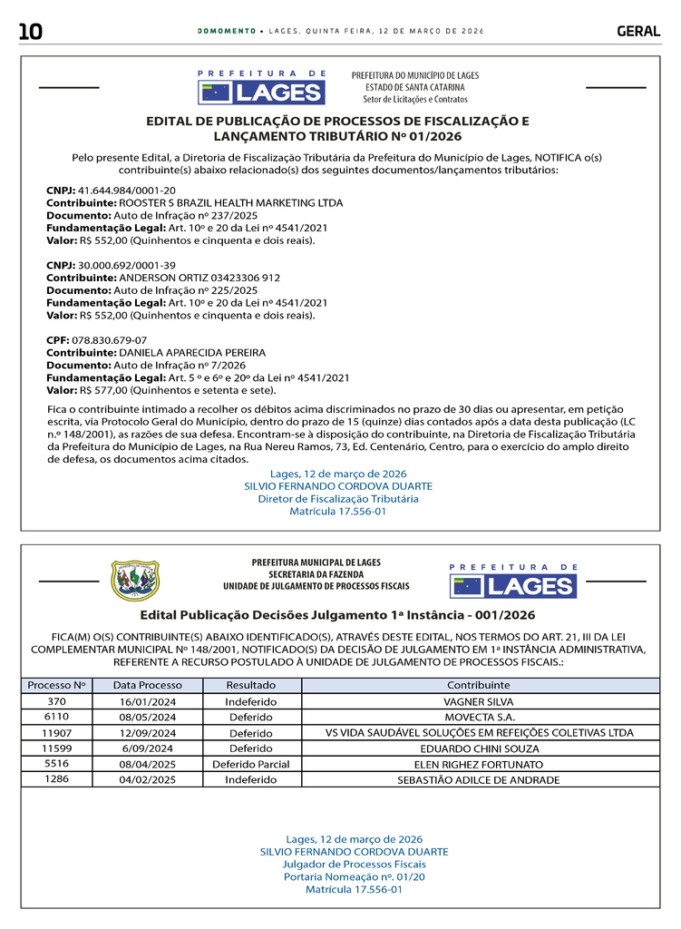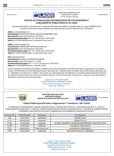 EDITAL DE PUBLICAÇÃO DE PROCESSOS DE FISCALIZAÇÃO E LANÇAMENTO TRIBUTÁRIO