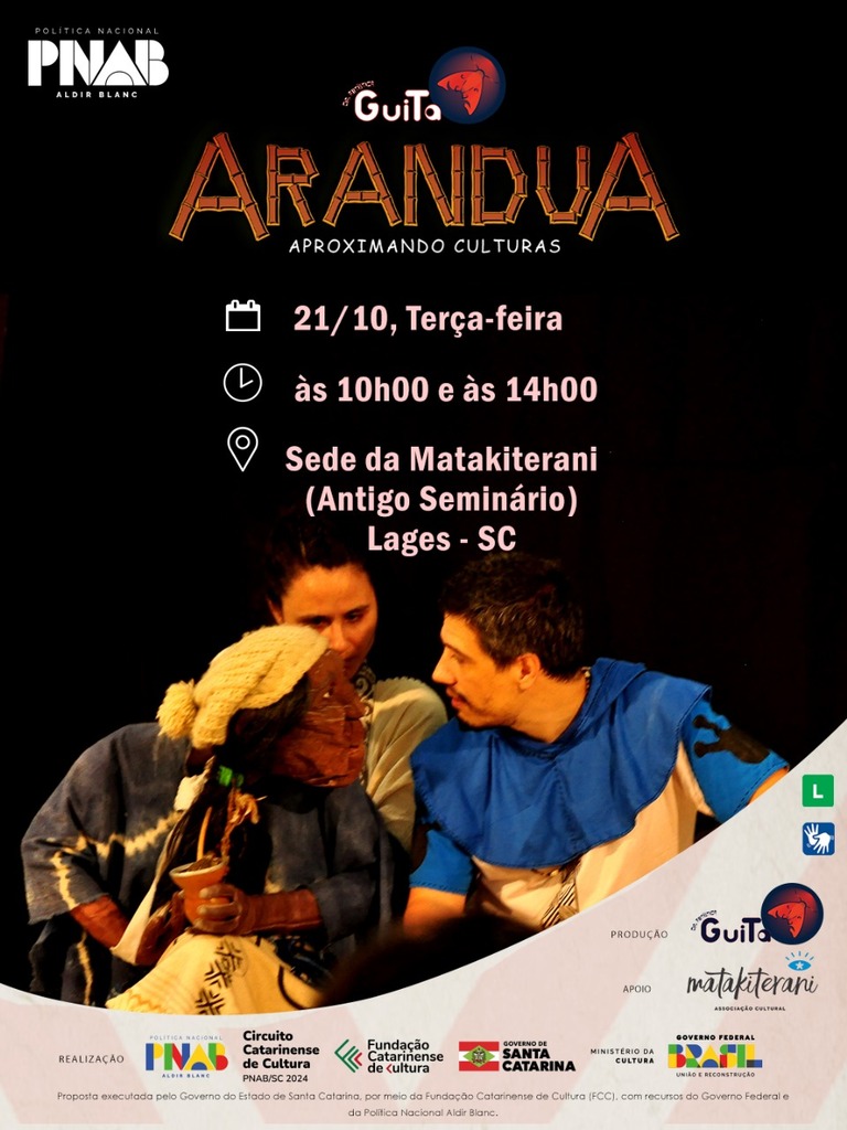 O espetáculo “Arandua – Aproximando Culturas”, da Cia Artística Guita, de Biguaçu-SC, será apresentado em Lages em duas sessões gratuitas nesta terça-feira, dia 21, às 10h e às 14h. Inspirado na cultura Guarani, o espetáculo nasceu do convívio dos integrantes na Aldeia Guarani Yynn Moroti Whera localizada em Biguaçu.