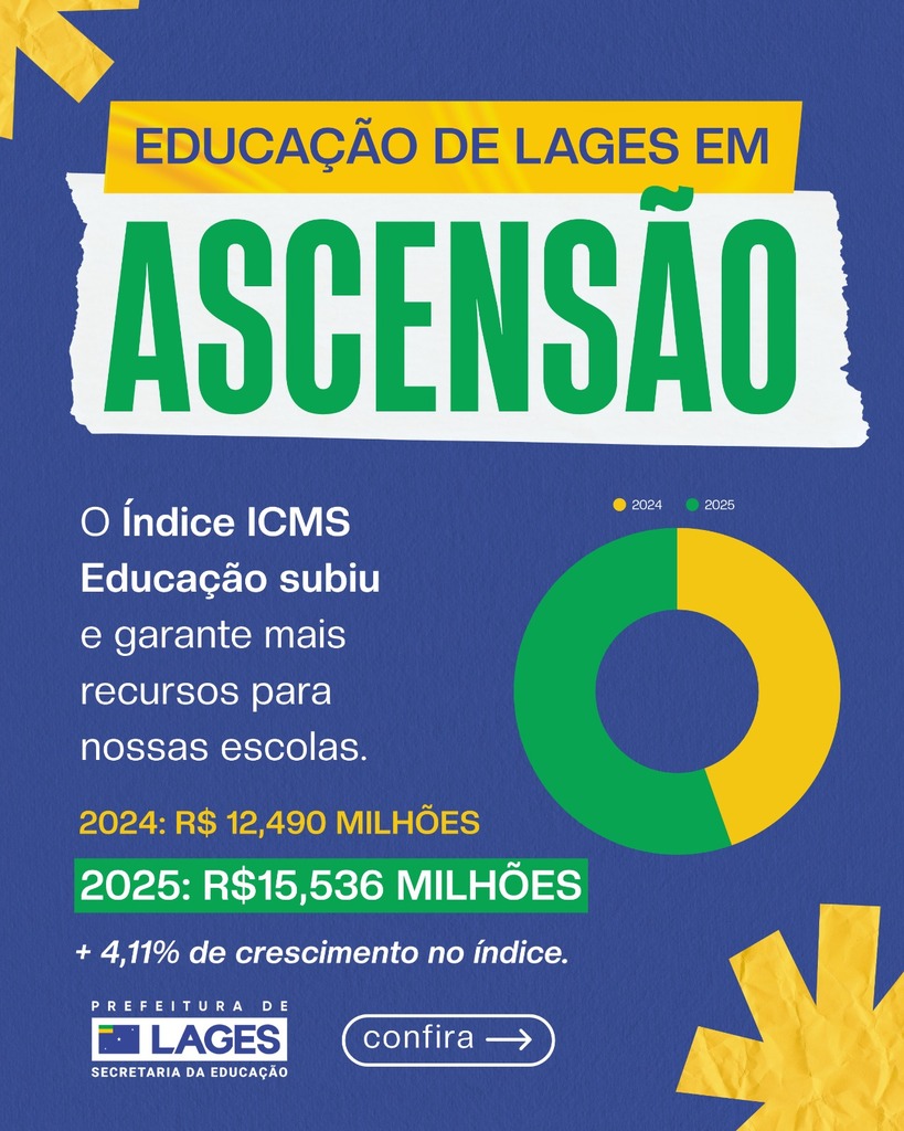 O município de Lages teve, em 2025, um aumento de 4,11% no índice do Imposto sobre Circulação de Mercadorias e Serviços (ICMS) Educação. O indicador subiu de 1,1311 em 2024 para 1,1776 em 2025, uma melhora de 0,0465 pontos. A cota-parte educacional do Imposto repassado ao município subiu de 10% para 12% no mesmo período. Em valores, o total repassado foi de R$ R$ 15,536 milhões, contra R$ 12,490 milhões em 2024. O ganho financeiro foi superior a R$ 3,045 milhões, o que garante mais investimentos na educação municipal.