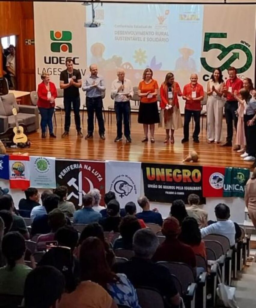A 3ª Conferência Estadual de Desenvolvimento Rural Sustentável de Santa Catarina, realizada nesta sexta-feira (5/12) no Centro de Ciências Agroveterinárias (CAV) da Universidade do Estado de Santa Catarina (Udesc), em Lages, registrou manifestações político-partidárias que ultrapassaram o conteúdo previsto na programação oficial do evento. Cerca de 150 pessoas participaram das atividades, que ocorreram em áreas internas e externas ao anfiteatro do campus.