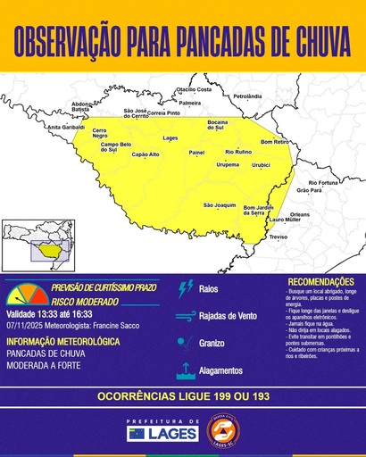 Em casos de emergência a população pode acionar a Defesa Civil de Lages pelo telefone 199 ou (49) 98406 4037.