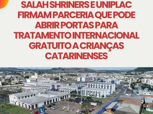O Salah Shriners Santa Catarina formaliza, na sexta-feira, 20 de fevereiro, às 13h30, em Lages, a assinatura de um convênio com a Fundação das Escolas Unidas do Planalto Catarinense (Fundação Uniplac), mantenedora da universidade. A parceria estabelece cooperação na triagem, no preparo pré-operatório e no acompanhamento pós-operatório de crianças com potencial elegível para tratamento especializado gratuito nos Estados Unidos.