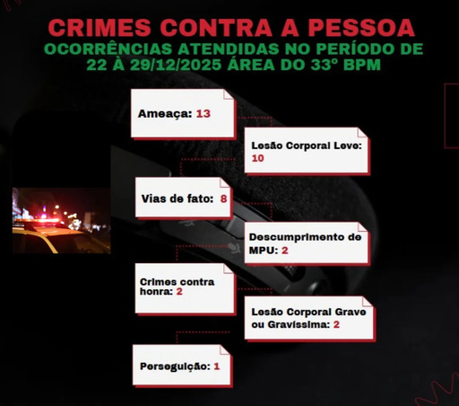 Durante o balanço das ações realizadas entre os dias 22 e 29 de dezembro, o Batalhão de Polícia Militar destacou que, além do policiamento preventivo e ostensivo reforçado para as festas de fim de ano, houve um número expressivo de atendimentos relacionados a crimes contra a pessoa.