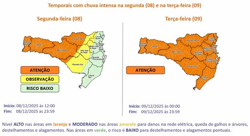 Ao longo da tarde e noite de segunda (08), há condições para temporais com chuva pontualmente intensa, rajadas de vento e eventual queda de granizo, especialmente no Grande Oeste catarinense. O risco é moderado a alto para ocorrências como destelhamentos, queda de galhos e árvores, danos na rede elétrica e alagamentos pontuais no Grande Oeste, Alto Vale do Itajái e Planaltos e moderado a baixo nas demais regiões.
