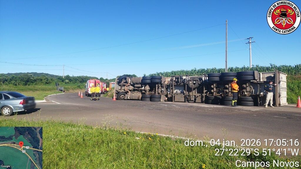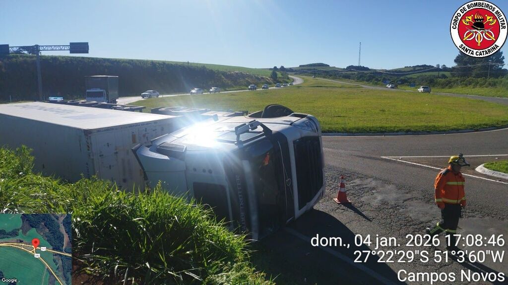 Campos Novos – Na tarde do dia 04 de janeiro , bombeiros de Campos Novos, atenderam a um acidente de trânsito com lesões corporais na BR-470, no trevo de acesso à BR-282, sentido ao município de Vargem. A ocorrência envolveu o capotamento de uma carretae teve apoio do SAMU de Vargem.