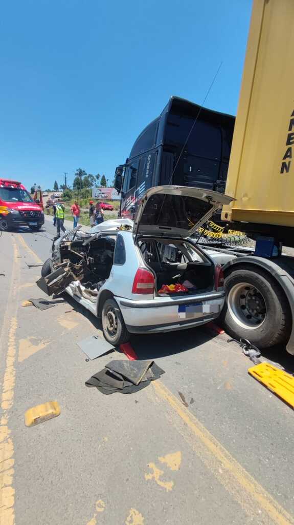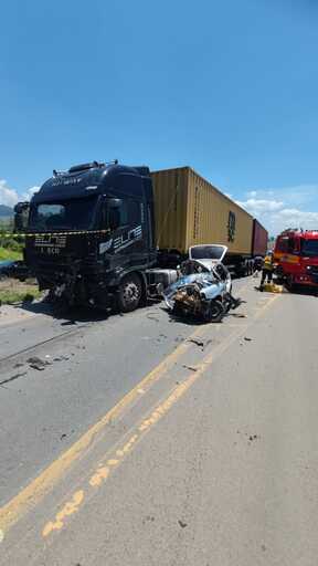 O motorista da carreta, um homem de 44 anos, estava consciente, orientado e caminhando pela cena, recusando atendimento. A colisão deixou os dois veículos sobre a pista, exigindo o apoio da Polícia Militar para controle do tráfego até a chegada da PRF e posterior limpeza do local.