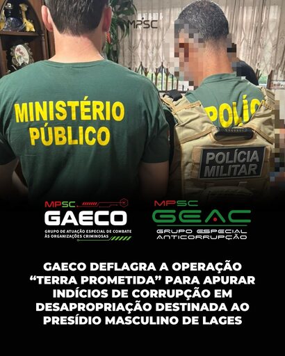 Na manhã desta quinta-feira (23/04), o Grupo de Atuação Especial de Combate às Organizações Criminosas (GAECO) e o Grupo Especial Anticorrupção (GEAC), ambos do Ministério Público de Santa Catarina (MPSC), deflagraram a Operação “Terra Prometida”, em apoio a Procedimento Investigatório Criminal (PIC) instaurado pela 15ª Promotoria de Justiça da Comarca de Lages. A investigação apura a prática de crimes contra a Administração Pública, relacionados a possível solicitação e pagamento de vantagem indevida vinculados à desapropriação de imóvel rural destinada à ampliação do Presídio Masculino de Lages.