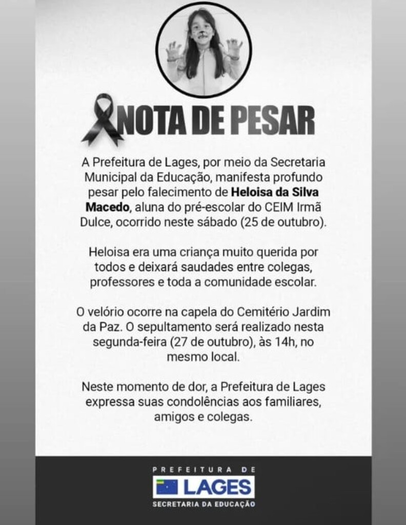 A sectretária Municipal de Educação de Lages, emitiu nota de pesar. Confira a nota abaixo: