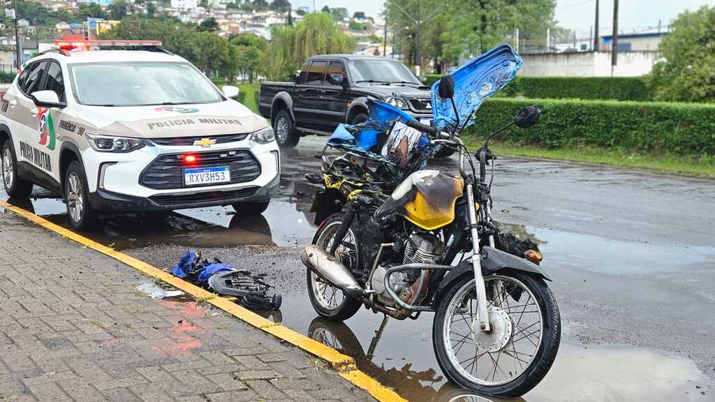 Uma colisão entre uma caminhonete Orochi e uma motocicleta provocou um incêndio na moto na tarde desta segunda-feira (27), na Avenida Belizário Ramos, em frente ao supermercado Fort Atacadista, em Lages.