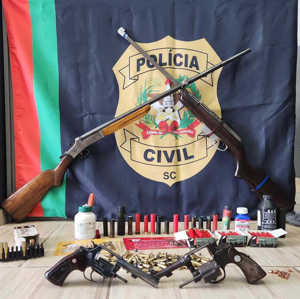 Durante as diligências, as equipes apreenderam quatro armas de fogo de diferentes calibres, diversas munições e materiais utilizados para recarga artesanal, como pólvora, chumbo e espoletas. Um dos investigados foi preso em flagrante delito, sendo todos os objetos encaminhados à Delegacia para os devidos procedimentos.
