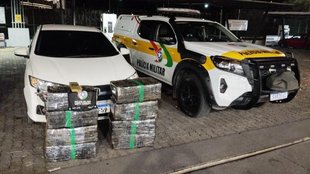 A maior carga caiu na BR-282, quando um Honda City tentou dar fuga, mas rodou poucos quilômetros. No confere, os policiais acharam 216 quilos de maconha espalhados pelo carro todo. O motorista, de 45 anos, caiu no grampo e o guri de 17 que tava junto foi apreendido.