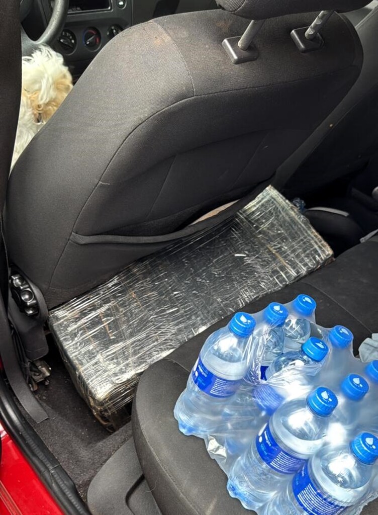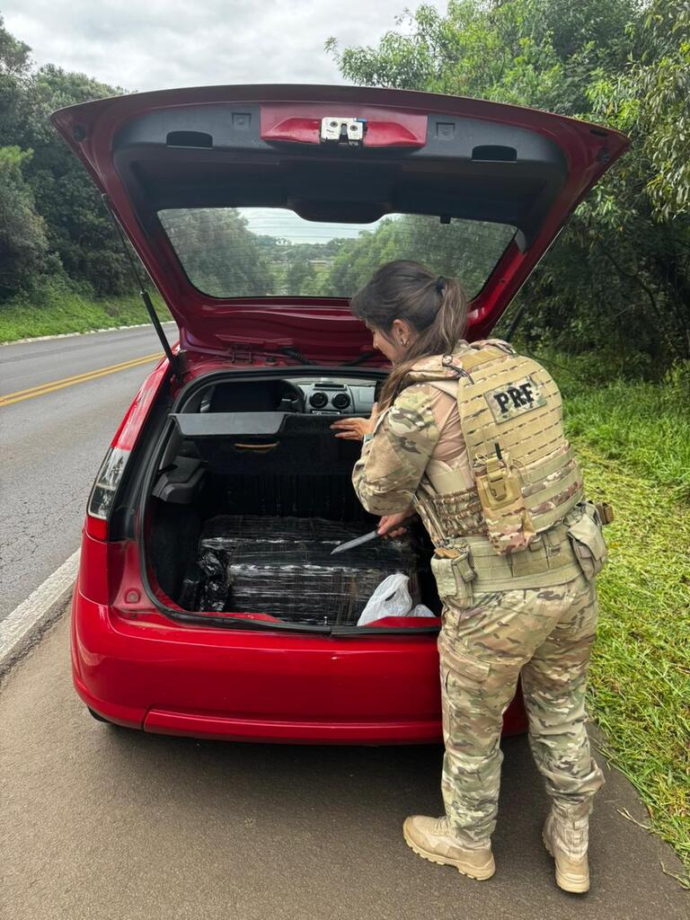 Durante abordagem a um Ford/Fiesta, placas de Laranjeiras do Sul/PR, os agentes encontraram um fardo envolto em plástico preto atrás do banco do motorista.