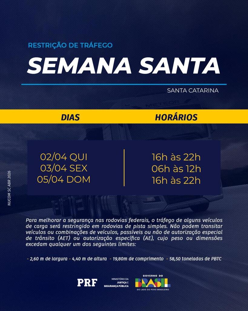 A Polícia Rodoviária Federal (PRF) inicia à zero hora desta quinta-feira (02), em todo o Brasil, a Operação Semana Santa 2026. A mobilização termina no domingo, dia 05 de abril, às 23h59min.