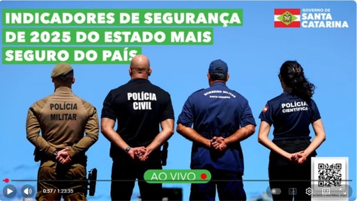Coletiva de imprensa para a apresentação dos índices de violência registrados em Santa Catarina, bem como de informações sobre o desempenho das forças de segurança em 2025. No ano passado, o Estado registrou menos homicídios e roubos do que nos últimos 18 anos e apresentou queda na maioria dos indicadores. Participam a Secretaria de Estado da Segurança Pública, a Polícia Militar, a Polícia Civil, a Polícia Científica e o Corpo de Bombeiros Militar.