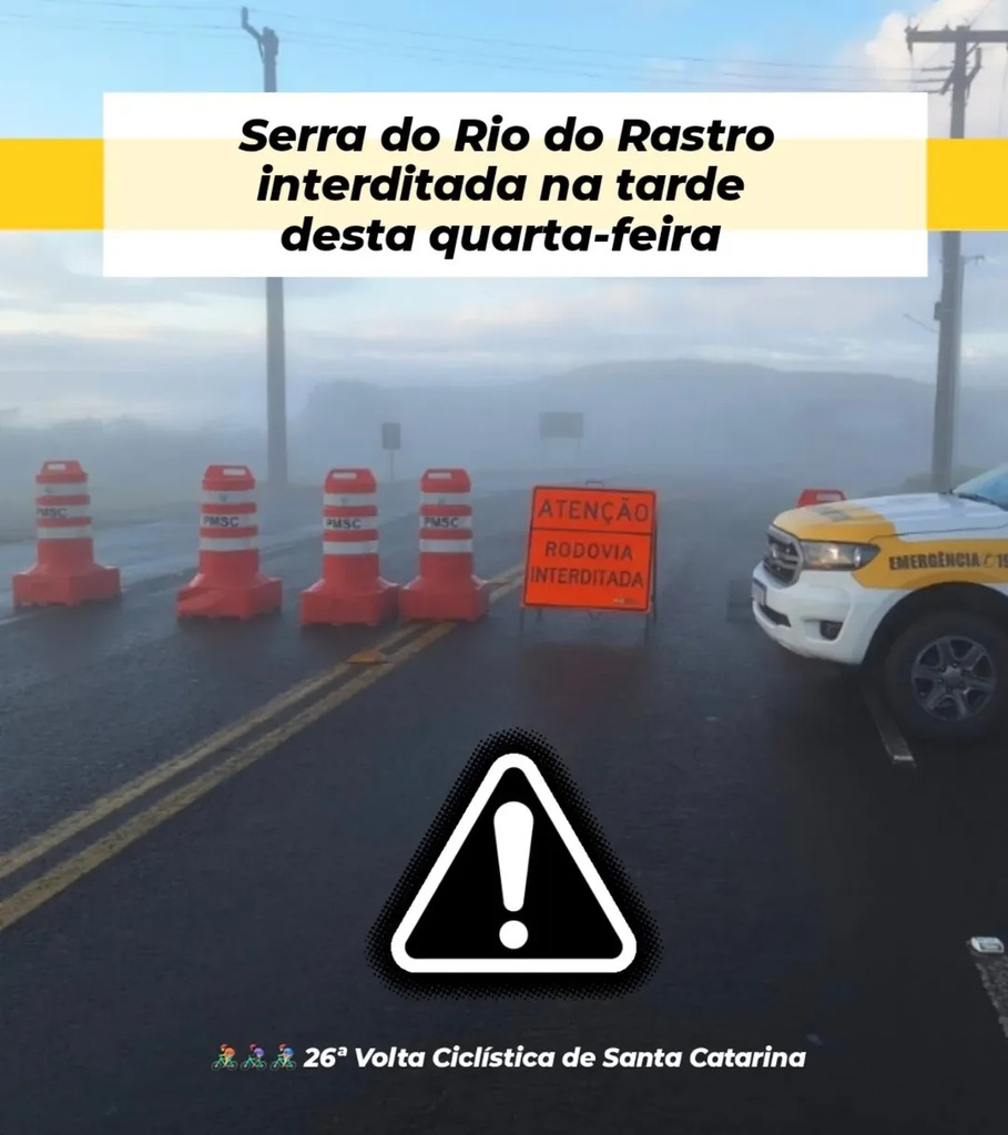 O Comando de Polícia Militar Rodoviária (CPMRv) informa aos usuários da SC-390 que nesta quarta-feira, 8, no período vespertino, entre às 13h45 e 16h, haverá a prova de ciclismo da 26ª Volta Ciclística de Santa Catarina e, por esta razão, o trânsito de veículos na Serra do Rio do Rastro estará interditado.