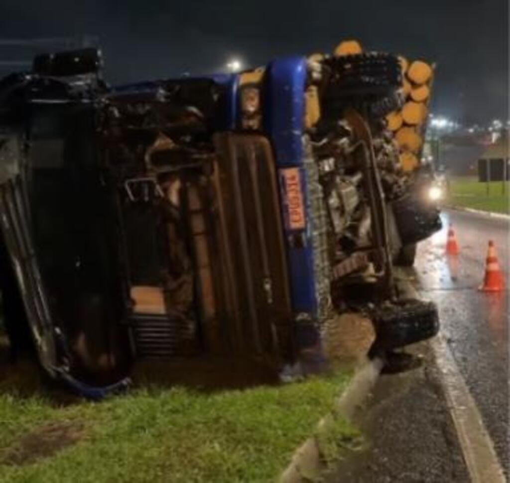 De acordo com as informações apuradas no local, apenas a parte frontal do caminhão, o cavalo mecânico, tombou, enquanto o reboque permaneceu na posição original. A carga de toras ficou espalhada às margens da rodovia. Equipes da concessionária responsável pela via atuam na sinalização e segurança do trecho. A PRF esteve no local e efetuou o levantamento pericial do acidente.