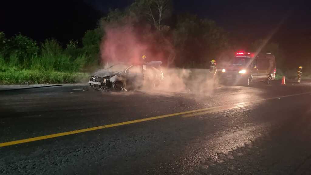 Veículo é destruído por incêndio na BR-470 em Ponte Alta