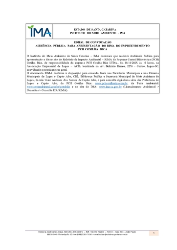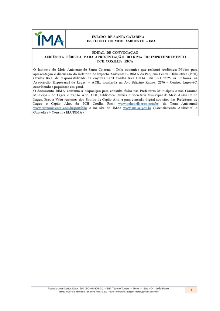 EDITAL DE CONVOCAÇÃO AUDIÊNCIA PÚBLICA PARA APRESENTAÇÃO DO RIMA DO EMPREENDIMENTO PCH COXILHA RICA