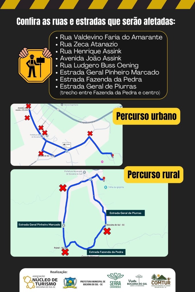 A Prefeitura Municipal de Bocaina do Sul e a organização do Festival de Primavera informam que, no sábado, dia 15 de novembro, entre 9h e 11h, haverá alterações no trânsito em decorrência da corrida de rua Desafio da Primavera.