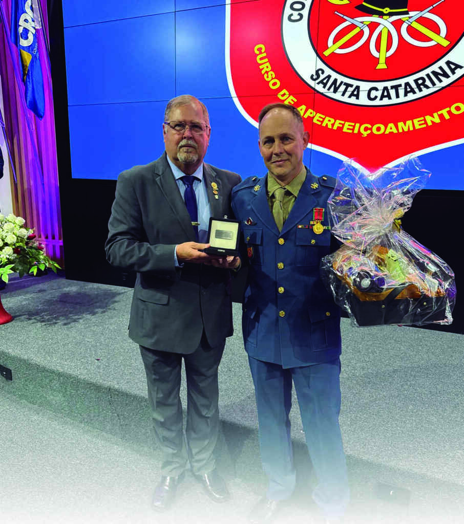 Ao todo, 59 Praças concluíram com excelência o CAP, com destaque para o 1º colocado geral, SGT. BM Mauricio Ducati, que recebeu da APRASC uma cesta e uma medalha de reconhecimento pelo excelente desempenho. Também se destacou o Diretor Regional BM da Grande Oeste, 2º SGT. BM Rodrigo Suzin, que concluiu com êxito o curso. A turma formou-se sob o nome “3º SGT BMRR Alécio Leontino”, em homenagem ao militar, que também foi reconhecido durante a solenidade. Homenagens especiais foram prestadas à paraninfa da turma, 1º SGT. BM Samira Coelho, e aos instrutores ST. BM Adriana Parrella e ST. BM Lindomar Martins, pelo comprometimento e dedicação durante todo o curso.