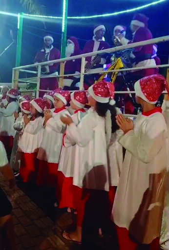 Outro ponto alto da noite foi a caminhada com velas acesas até a praça central, criando um cenário de grande simbolismo e emoção. Na chegada à praça, a comunidade recebeu com entusiasmo o Papai Noel, acompanhado por sua banda, que animou o público com músicas natalinas.