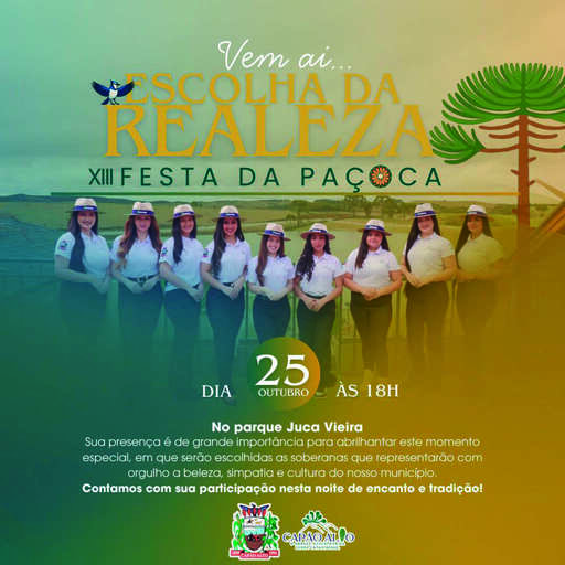 O município de Capão Alto se prepara para uma noite especial neste sábado, dia 25, no Parque Juca Vieira. A partir das 18 horas, acontece o desfile que definirá a nova Realeza da XIII Festa da Paçoca, um dos momentos mais aguardados do evento.