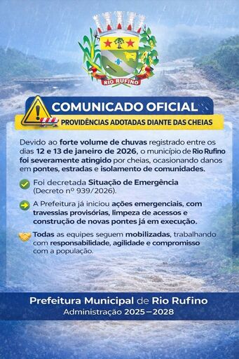 A Prefeitura Municipal de Rio Rufino, através da Prefeita Interina Erane das Graças Lorenzetti Pickler informa que, em razão do forte volume de chuvas registrado entre a noite de segunda-feira (12) e a madrugada terça-feira (13), o município foi severamente atingido por cheias que ocasionaram diversos danos, incluindo arrancamento de pontes, desmoronamento de barrancos e isolamento de comunidades.