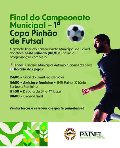O esporte painelense estará em festa neste sábado, dia 8 de novembro, com as grandes decisões da 1ª Copa Pinhão de Futsal, que serão disputadas no Ginásio Municipal Antônio Gabriel da Silva. A programação promete muita emoção e torcida do início ao fim, reunindo atletas, famílias e apaixonados pelo futsal.