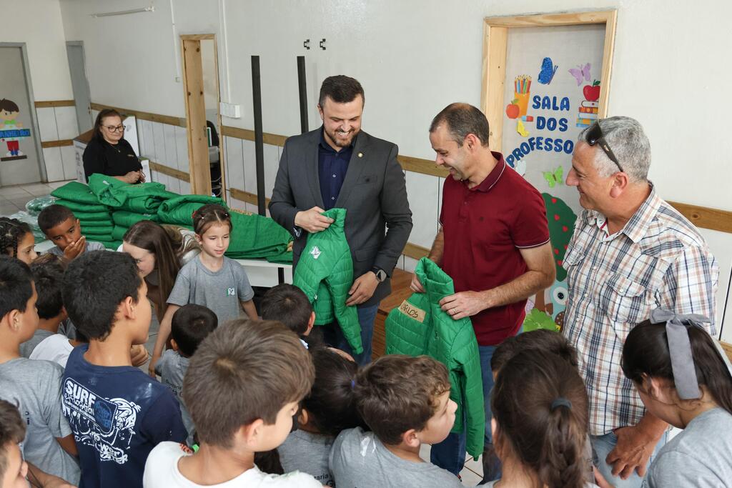 O deputado estadual Lucas Neves (Podemos) participou da entrega de novos uniformes escolares em Anita Garibaldi. A ação, em parceria com o prefeito Henrique Menegazzo, beneficiou alunos de todas as escolas municipais com jaquetas e outras peças.