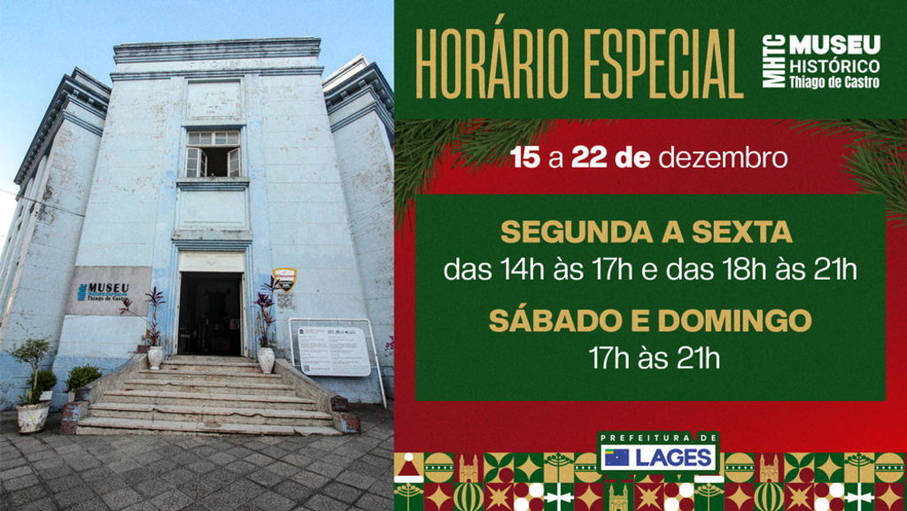 O Museu Histórico Thiago de Castro (MHTC) funcionará em horário especial entre os dias 15 e 22 de dezembro, durante a programação do Natal FelizCidade, com o objetivo de ampliar o acesso da comunidade e de visitantes que passam pelo Centro de Lages neste período.