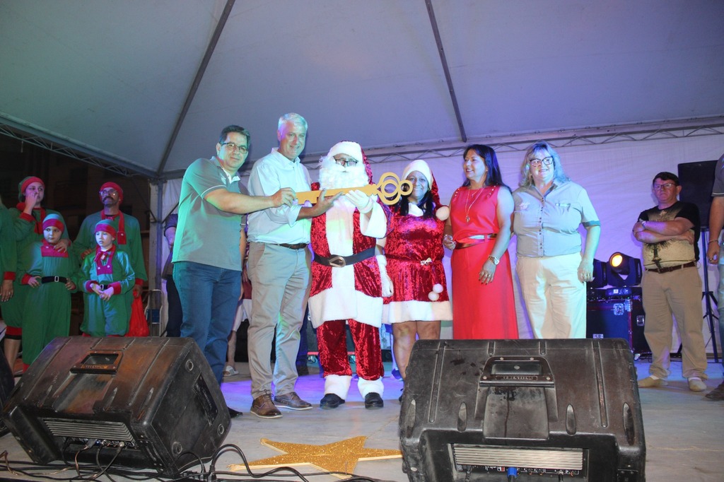 O bom velhinho distribuiu balas e abraços à criançada e recebeu simbolicamente a chave da cidade, entregue pelo prefeito Fabiano Baldessar de Souza e pelo vice-prefeito Leonir Ribeiro Silva, oficializando o início das festividades natalinas no município.