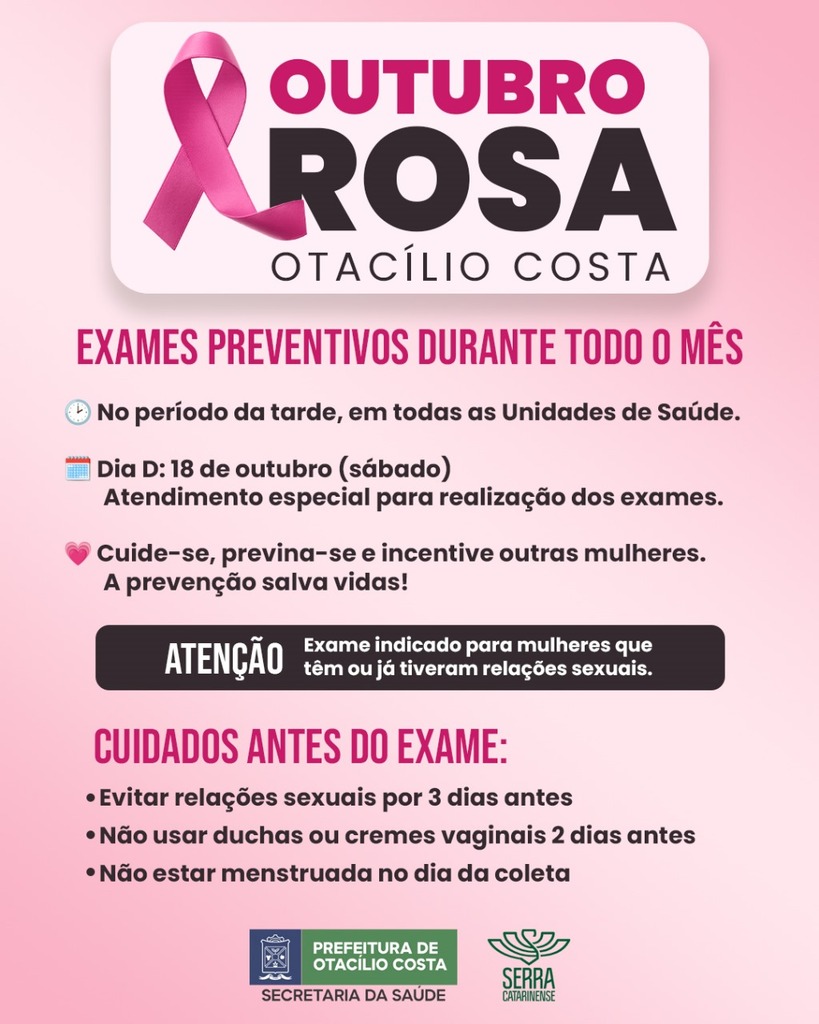Durante todo o mês de outubro, a Secretaria Municipal de Saúde de Otacílio Costa promove a campanha Outubro Rosa, voltada à prevenção e ao diagnóstico precoce do câncer de colo de útero. Todas as Unidades de Saúde do município estarão com atendimento especial para a realização do exame preventivo (Papanicolau).