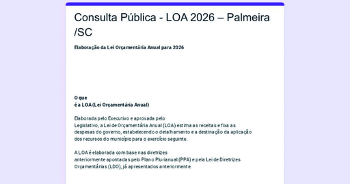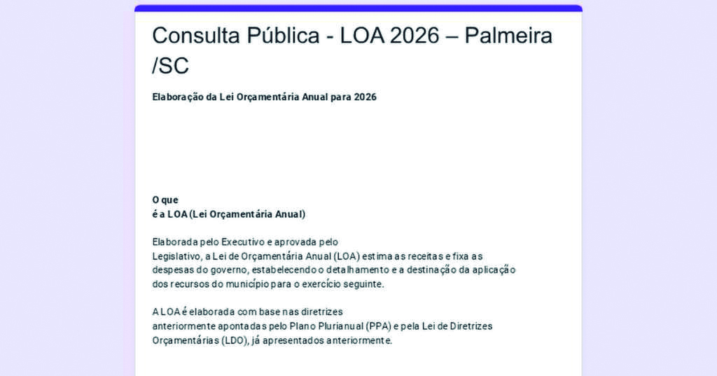 Com um questionário online fácil de preencher — acessível até pelo celular — qualquer cidadão pode indicar quais áreas da cidade, em sua opinião, devem receber mais atenção no próximo ano: saúde, educação, estradas, cultura, esporte, segurança e muito mais.
