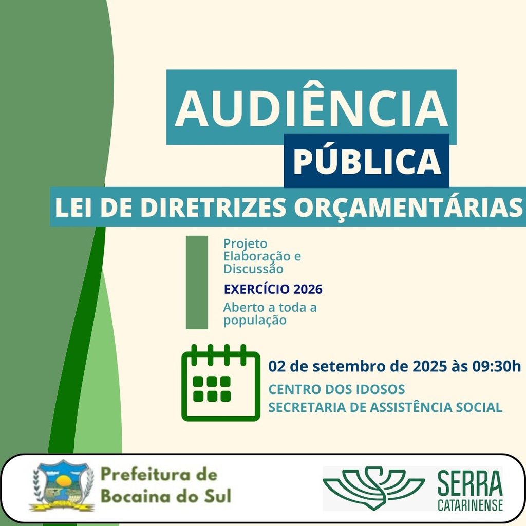 A Prefeitura de Bocaina do Sul convida toda a comunidade para participar da Audiência Pública da Lei de Diretrizes Orçamentárias (LDO) para o exercício de 2026, que será realizada no próximo dia 02 de setembro de 2025, às 09h30, na Secretaria de Assistência Social – Centro dos Idosos.