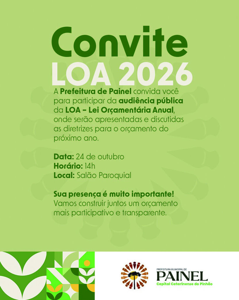 A Prefeitura de Painel convida toda a comunidade para participar da audiência pública da LOA – Lei Orçamentária Anual, que definirá as prioridades e diretrizes do orçamento municipal para o próximo ano. O encontro acontecerá no dia 24 de outubro, às 14 horas, no Salão Paroquial.