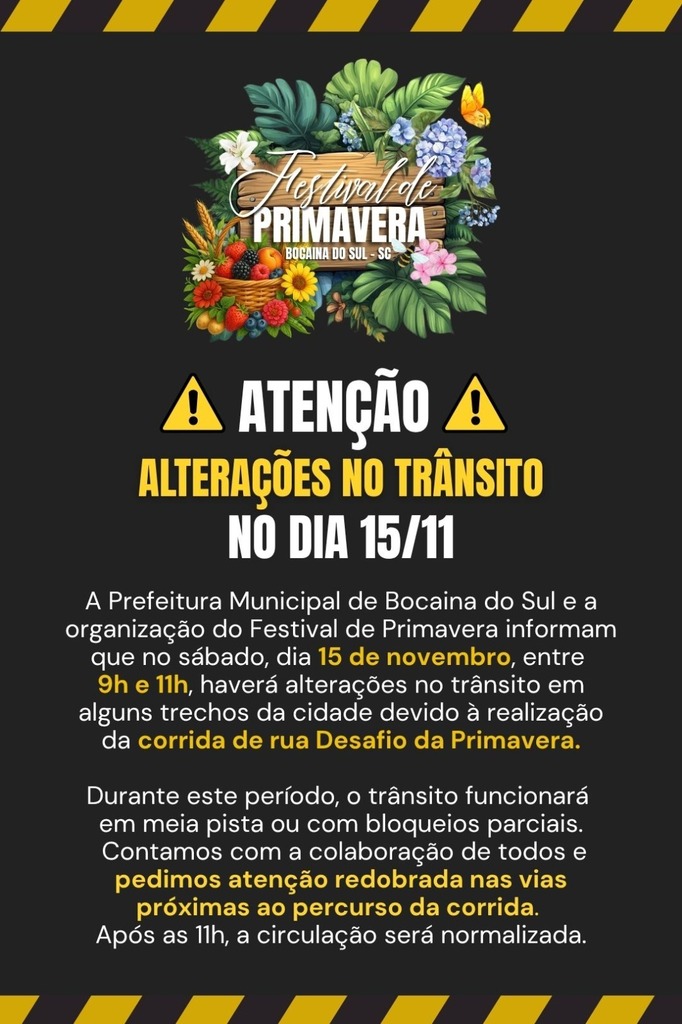 A Prefeitura Municipal de Bocaina do Sul, em conjunto com a organização do Festival de Primavera, divulgou um comunicado oficial informando que haverá alterações no trânsito da cidade neste sábado (15 de novembro), entre 9h e 11h, em razão da realização da corrida de rua Desafio da Primavera.