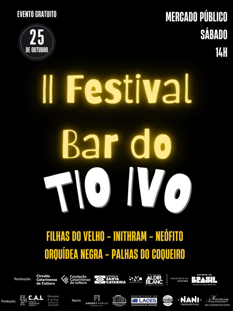 O II Festival Bar do Tio Ivo será realizado no dia 25 de outubro de 2025, no Mercado Público Municipal Osvaldo Uncini, em Lages. O evento, com entrada gratuita, tem início às 14h e se estende até as 18h. O público é convidado a doar um quilo de alimento não perecível, que será destinado ao Centro de Direitos Humanos Irmã Jandira Bettoni, instituição que atende pessoas em situação de rua.