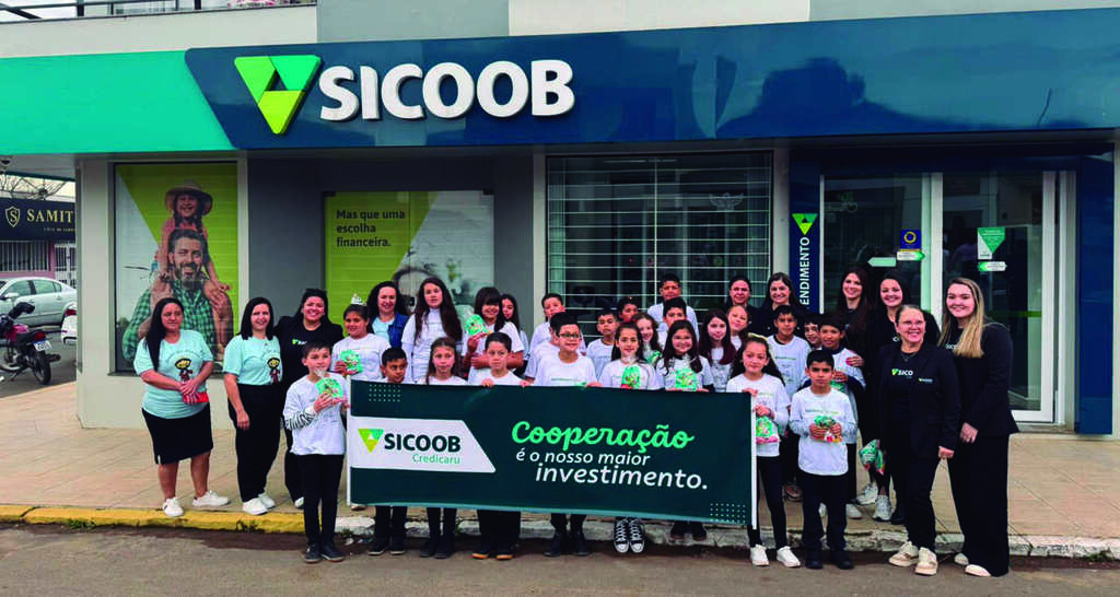 Durante o Desfile Cívico em Ponte Alta, a turma do 4º ano da escola São Francisco representou a Agência do Sicoob Credicaru.