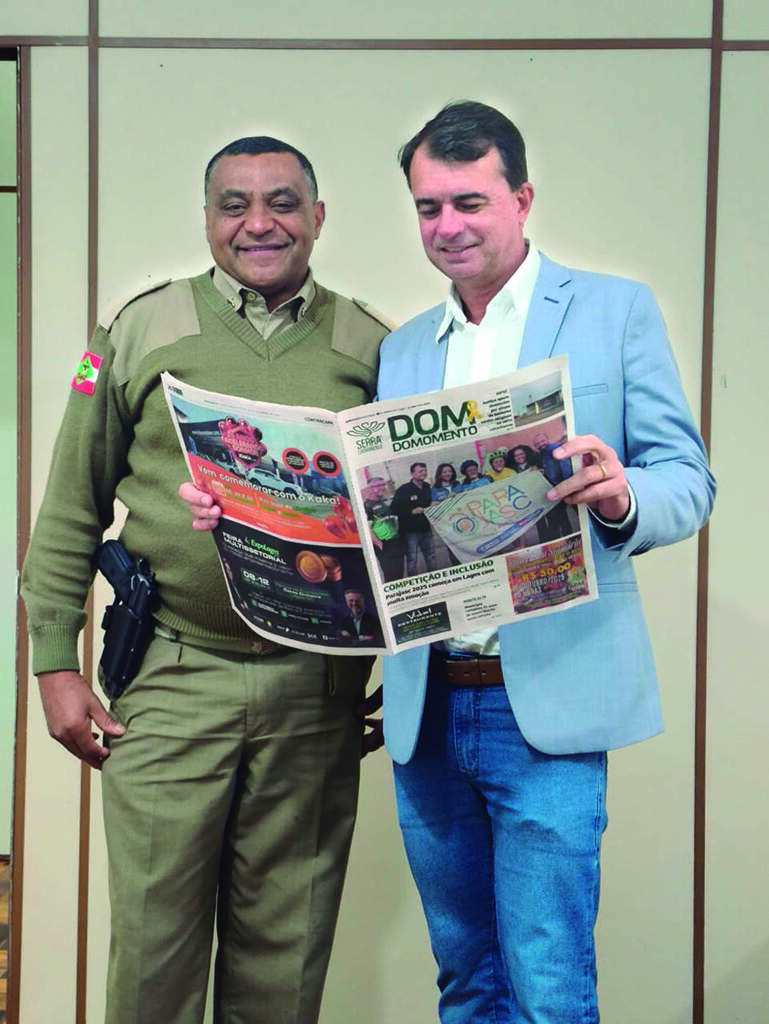 O Subtenente Osmailton, entregando um exemplar do Jornal Domomento para o Secretário da FESPORTE de Santa Catarina, Jeferson Ramos Batista.