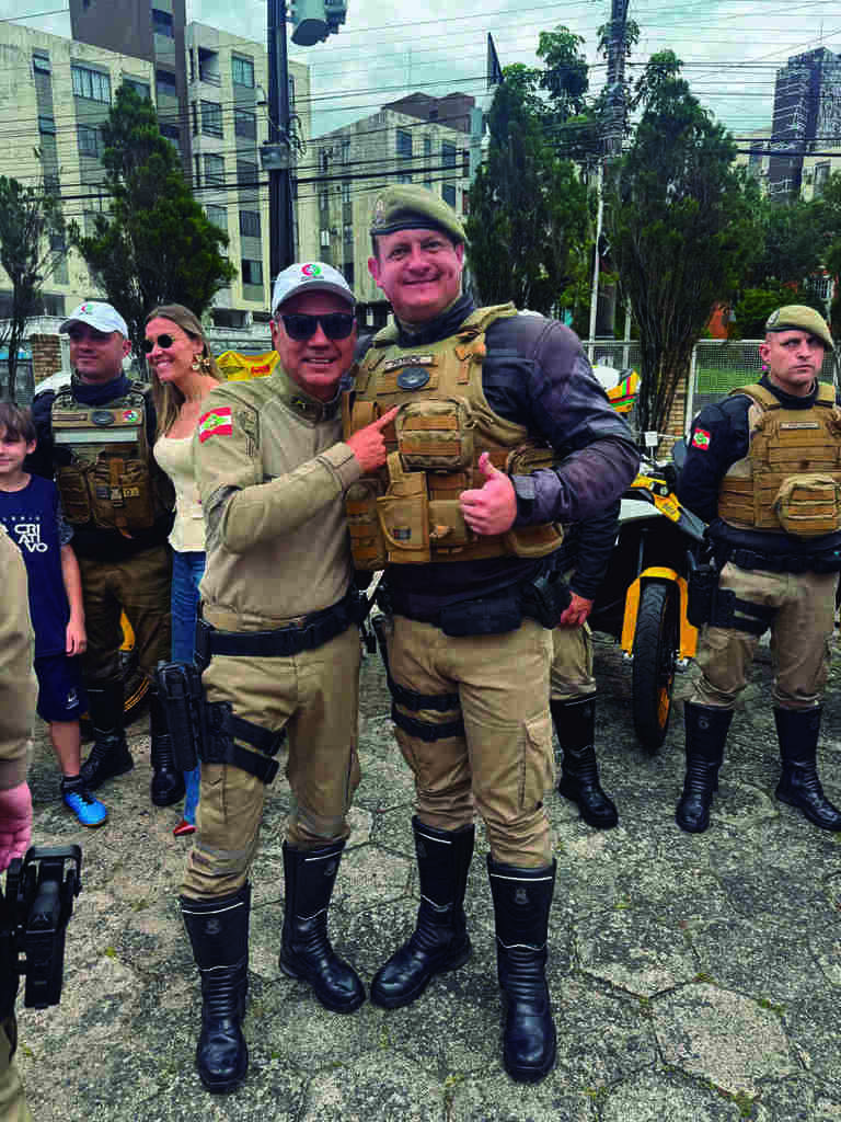 O Sargento Patrick recebe o breve do Sub Tenente Giovani, durante a formatura do 1º Curso de Escolta com Batedores do CPMRv. A formatura ocorreu no dia 12 de novembro, durante a cerimônia alusiva os 48 anos do Comando de Polícia Militar Rodoviária (CPMRv)