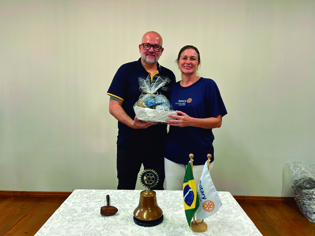 Fabio Tosatti, Presidente do Rotary Club de Lages Alvorada, que fez aniversário dia 25 de fevereiro, recebendo das mãos de Josyane Polese, uma lembrança pela passagem da data.