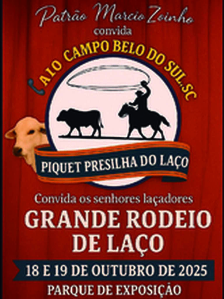 Nos dias 18 e 19, o parque de exposições Sobradinho, em Campo Belo do Sul, será palco de muita tradição e competições no Grande Rodeio de Laço, organizado pelo patrão Márcio Zoinho.